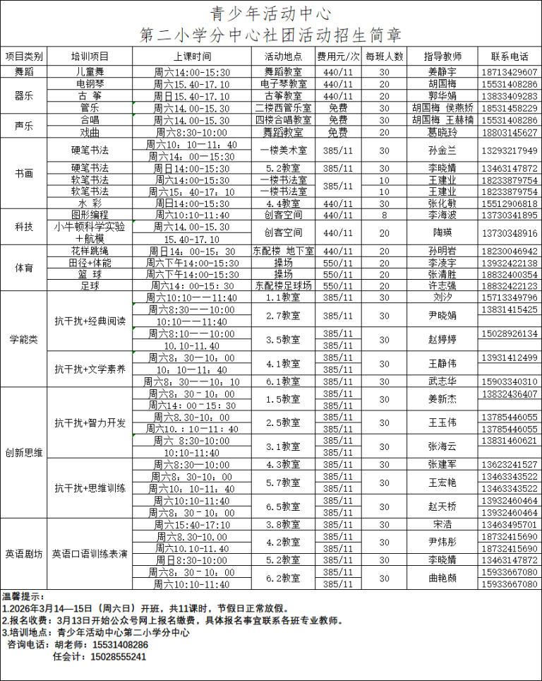 青少年活动中心2026年1月24日—2月7日,共15次课,具体内容见招生简章。